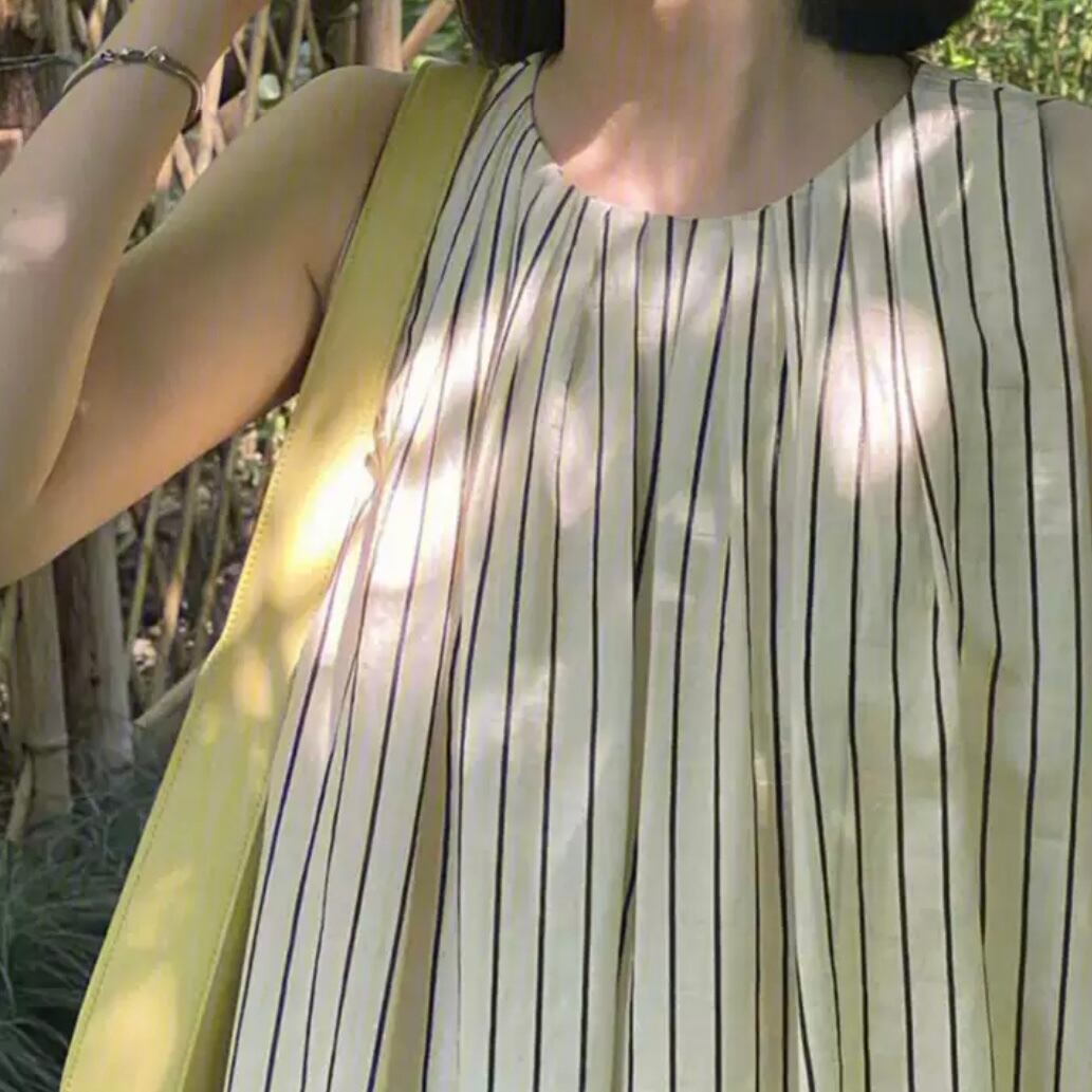 ネックラインに寄せたギャザーが織りなすボリュームデザインが、今季らしいストライプロングワンピース。
