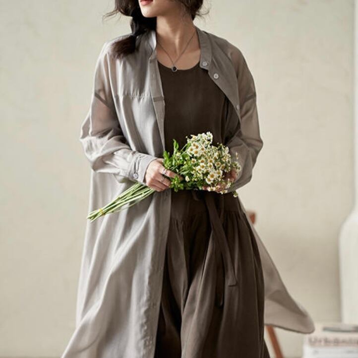 サイドスリットがアクセントの透け感がきれいなシアーロングシャツ。