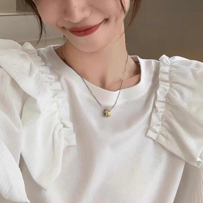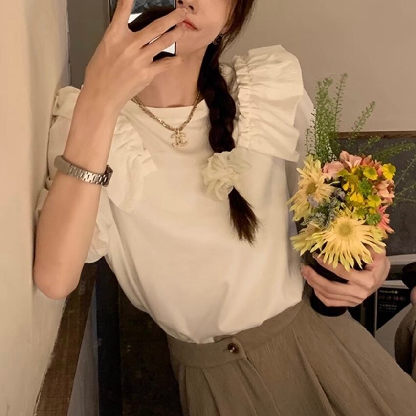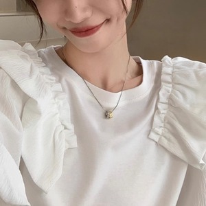 ショルダーフリルが印象的な大人かわいいフェミニントップス。