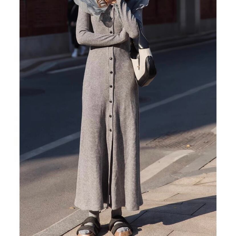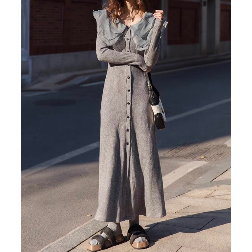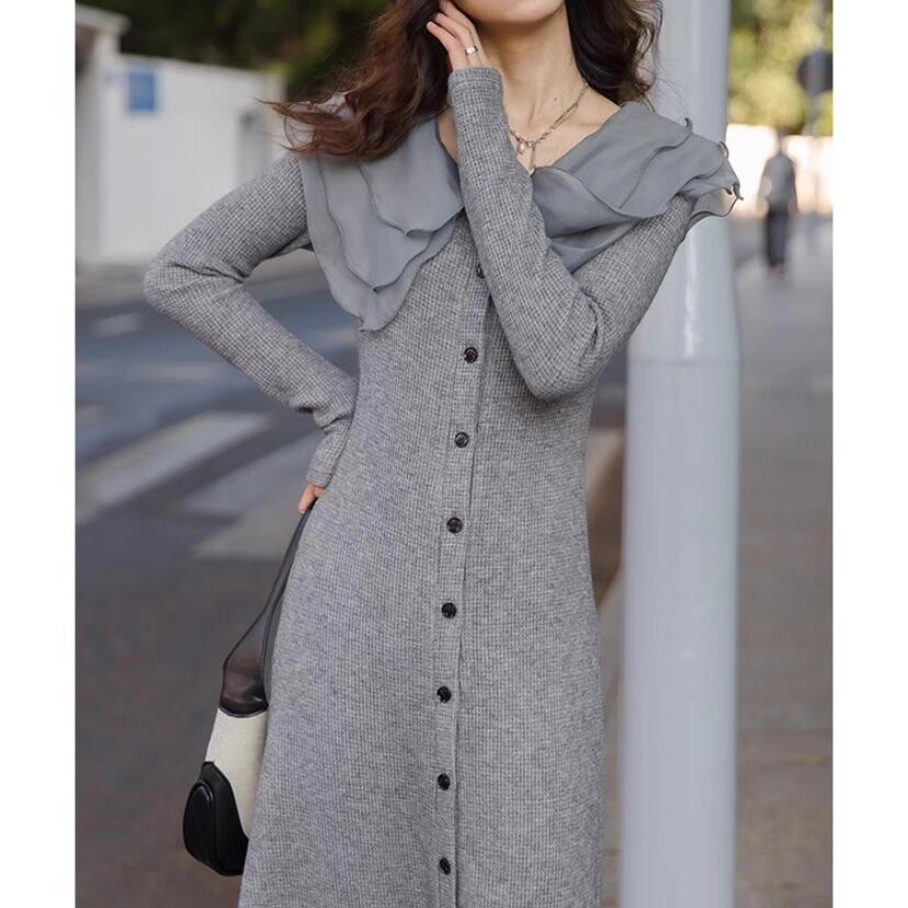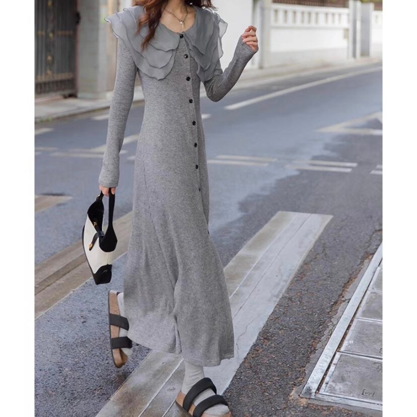 程よいフィット感のあるニットワンピースに異素材のティアードのビックカラーが目を惹きます。